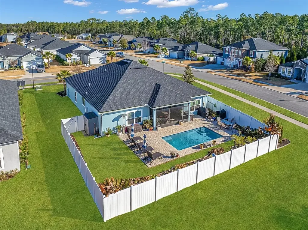 This beautiful and spacious 4-bedroom plus home office, 2-bathroom pool home is situated on a desirable corner lot in the sought-after Amelia Concourse community of Fernandina Beach. With 2,210 square feet of living space, the open-concept layout features durable LVP flooring, a bright and inviting atmosphere, and a modern kitchen with quartz countertops, gas stove, abundant cabinetry, and a large eat-in area overlooking the living room. A formal dining room provides additional flexibility for entertaining. The split-bedroom floor plan ensures privacy for the owner’s suite, which includes a walk-in closet, dual sinks, a luxurious walk-in tile shower, and a separate water closet. Additional bedrooms offer comfort and versatility, with one featuring a walk-in closet and another located off the kitchen, perfect for use as an office or guest space. The home is equipped with wired surround sound, a tankless water heater, and a thoughtfully designed laundry room with cabinets, a utility sink, and washer and dryer that convey. The two-car garage offers additional storage space. Outdoor living shines with a screened lanai with pavers and ceiling fan, a sparkling chlorine pool with paver surround, and a fenced backyard. Triple sliding glass doors provide seamless indoor/outdoor living. Conveniently located near shopping, dining, and the beaches of Fernandina, this home combines comfort, style, and the best of coastal living.