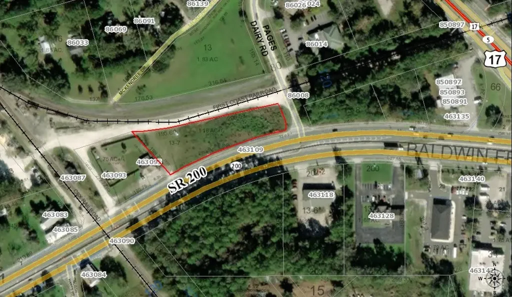 Location, Location, Location! 408 ft of frontage on SR-200 (busiest street in Nassau County). Corner lot at the intersection of Pages Dairy Road and SR-200. Property is located in the Timbers to Tides SR-200 Overlay District and is zoned T5 allowing for a variety of commercial uses such as retail, service establishments (hair salon, contractor services, etc.), recreation center, restaurant, professional office, etc. Call us about your intended use and we'll help determine how it can be developed.
